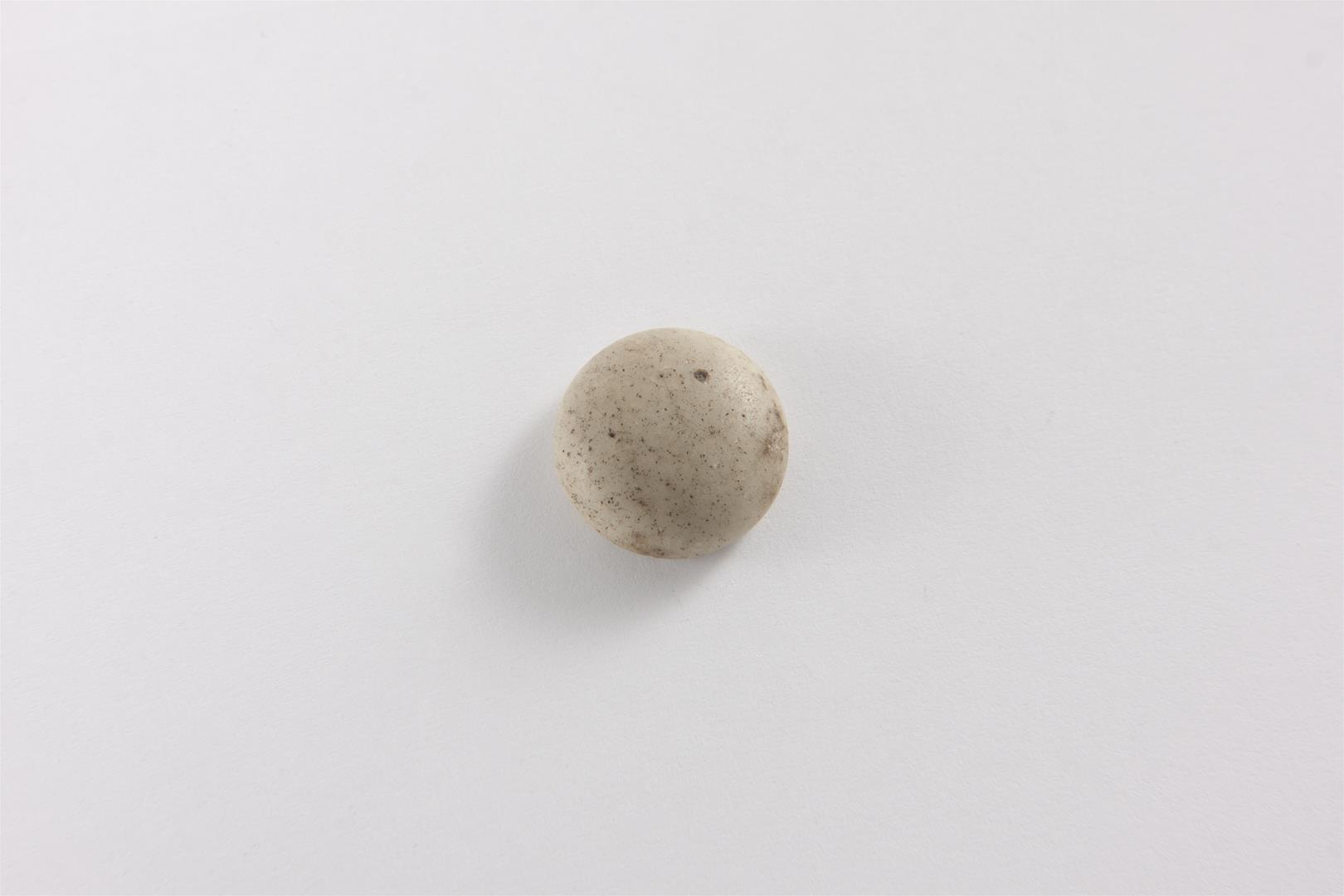Objeto em pasta vítrea (tesserae), de cor branca, forma circular com base aplanada, provavelmente usado em jogo de tabuleiro.