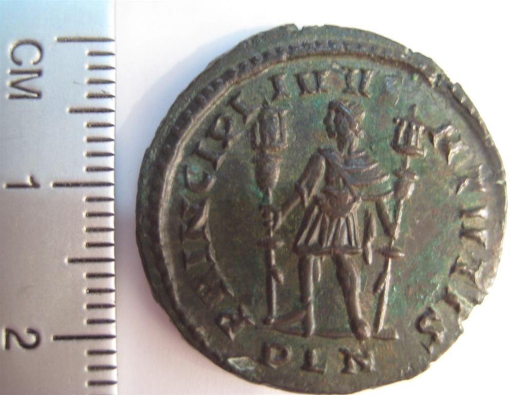 Nummus cunhado  entre os anos de 307 e 310 d.C. pelo Imperador Constantino, na oficina de Londinium. Anverso: IMP CONSTANTINVS P F AVG, com busto à direita, laureado e couraçado. Reverso: PRINCIPI-IVVE-NTVTIS, com Príncipe empunhando dois estandartes. Esta moeda, que resultou de uma reforma do sistema monetário por Diocleciano (294 d. C.), pertence a um tesouro que rondaria as 300 peças, considerado excepcional pela sua raridade na Península Ibérica.
