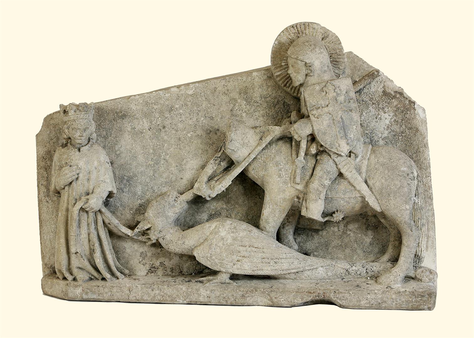 Escultura em alto-relevo do século XV, em calcário de Ançã -Portunhos, proveniente da fachada da Ermida de São Jorge da freguesia de Marecos, que apresenta paralelos com o retábulo de Eira Pedrinha (Coimbra) datado, por inscrição, de 1398. A autoria da obra é atribuída ao Mestre João Afonso, de Coimbra, cuja oficina está documentada entre 1439 e 1469. O culto a este santo, patrono das milícias, teve a sua expansão em Portugal depois da Batalha de Aljubarrota, provavelmente por influência do exército inglês. A iconografia do santo, combatendo o dragão e libertando a princesa, nasceu no século XI. Foi adotada e difundida pelos cruzados da Terra Santa, juntamente com São Tiago, ambos patronos dos exércitos cristãos na luta contra os mouros.